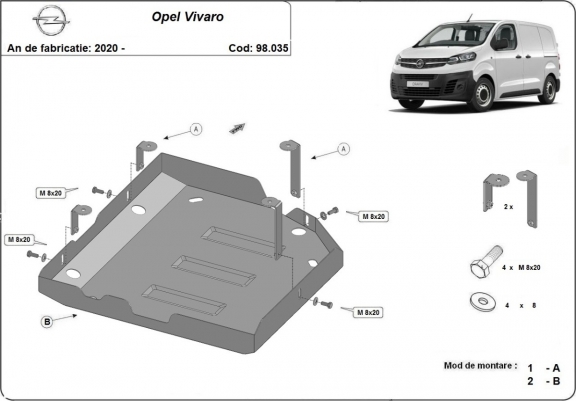 Acél motorvédő lemezünk a következőket védi: AdBlue tartály A motorvédő lemez új, és tökéletesen illeszkedik a Opel Vivaro összes 2020 és 2026 között gyártott változatához. 2 mm vastag Acéllemezből készült. Gyárilag kialakított pontokhoz csatlakozik. Méretpontos, A38 H2H acéllemez Minden szükséges tartozék és csavar a csomagban! Minden motorvédőlemezünk porszórt bevonattal van ellátva(porfestett felület), hogy megakadályozza a korróziót. Méretpontos acél lemezekből készül. |