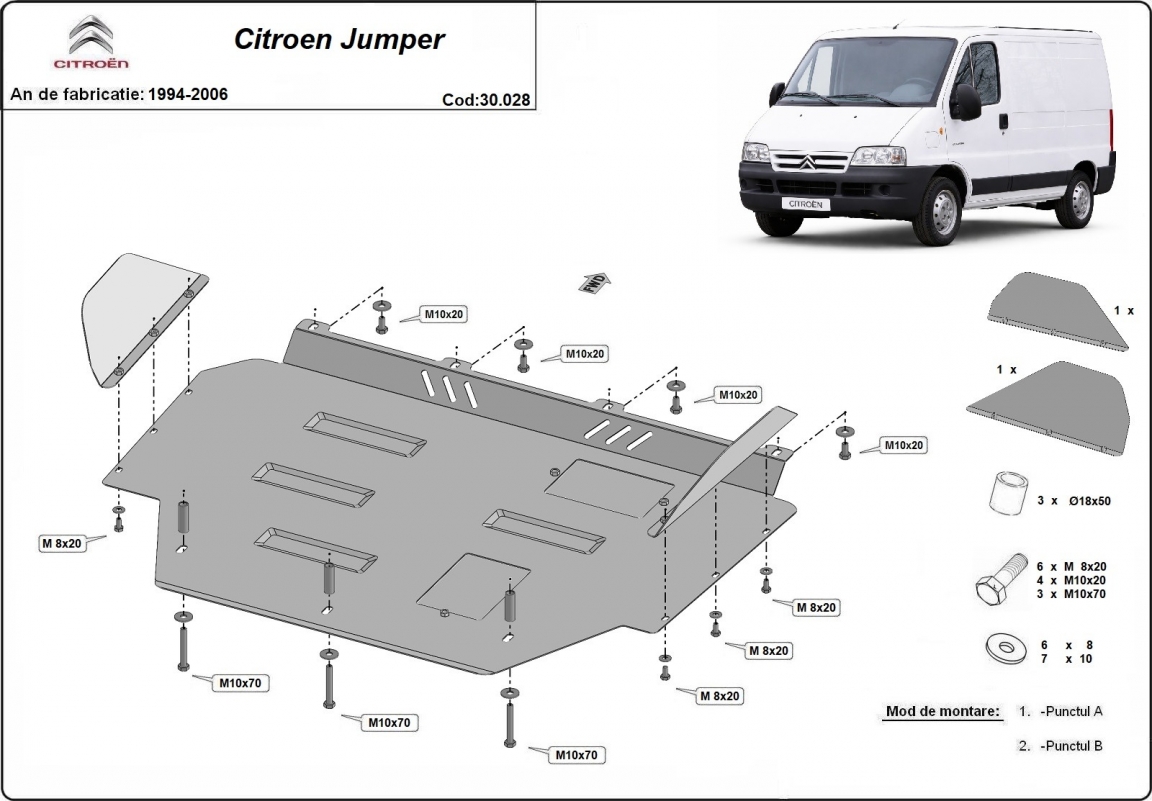 Protection sous moteur pour Jumper essence. Construction solide mais la trappe à huile touche la vis de vidange, il a fallu créer un trou de dégagement à la scie cloche et les roues touchent les bordures amovibles, il a fallut tordre les pattes pour gagner plusieurs centimètres d'espace de sécurité. Après ces modifications, le montage est facile. Bon produit dans l'ensemble.