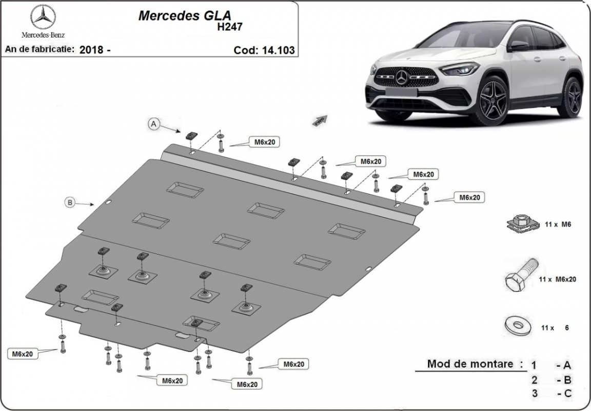 Acél motorvédő lemezünk a következőket védi: motor, kapcsolószekrény, radiátor A motorvédő lemez új, és tökéletesen illeszkedik a Mercedes GLA H247 összes 2019 és 2026 között gyártott változatához. 2 mm vastag Acéllemezből készült. Gyárilag kialakított pontokhoz csatlakozik. Méretpontos, A38 H2H acéllemez Minden szükséges tartozék és csavar a csomagban! Minden motorvédőlemezünk porszórt bevonattal van ellátva(porfestett felület), hogy megakadályozza a korróziót. Méretpontos acél lemezekből készül. |
