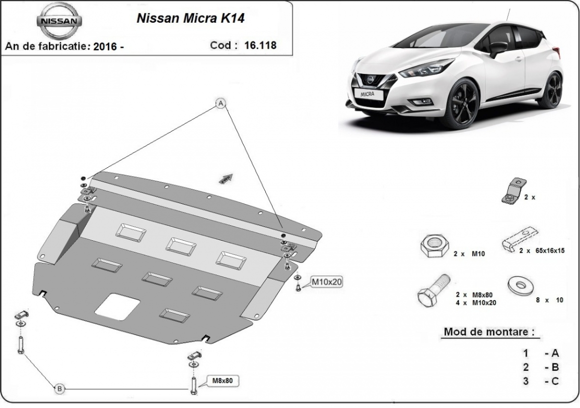 | Minden autóban gyári csavarlyukak vannak a motorvédő lemez felszereléséhez, ami nagyon egyszerűvé teszi a felszerelést. Ezt megteheti saját maga, vagy bármely autószervizben. |