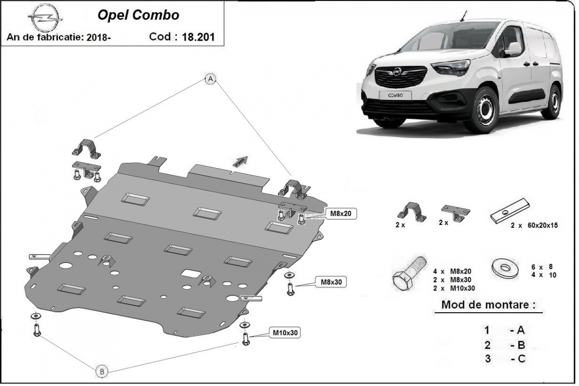 Acél motorvédő lemezünk a következőket védi: motor, kapcsolószekrény, radiátor, első lökharító A motorvédő lemez új, és tökéletesen illeszkedik a Opel Combo összes 2018 és 2026 között gyártott változatához. 2 mm vastag Acéllemezből készült. Gyárilag kialakított pontokhoz csatlakozik. Méretpontos, A38 H2H acéllemez Minden szükséges tartozék és csavar a csomagban! Minden motorvédőlemezünk porszórt bevonattal van ellátva(porfestett felület), hogy megakadályozza a korróziót. Méretpontos acél lemezekből készül. |