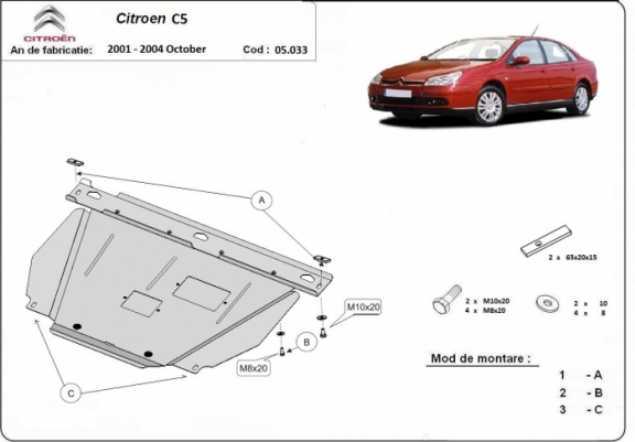 Montage sur citroen C5 phase 1 Tole suffisament epaisse, par contre les trous de fixation a la limite de necessiter un coup de lime. Les plis rigidifient bien la tole, mais quelques ouverture supplementaires auraient put evacuer un peu mieux la chaleur moteur et echappement. Les trappes de visites pour vidange et filtre ne sont pas alignees et la peinture manque de cuisson. Livraison avec suivi sans reproche, dans les temps indiquer, malgre le grand trajet.
