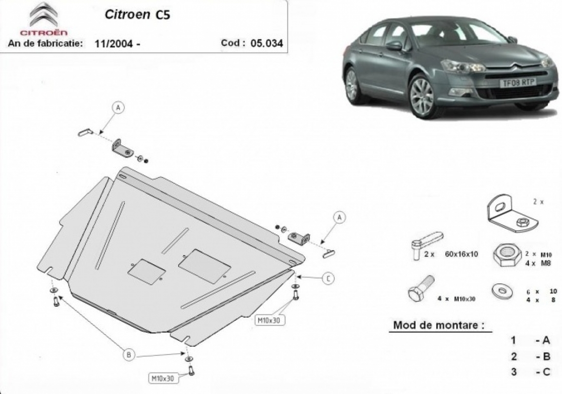 Compré cubrecarter para c5 II. Las aperturas para el drenaje del aceite y la valvulina no coinciden. El mio es el 2.0hdi 138cv.los anclajes traseros tampoco coinciden. Tuve que adaptar. Y los anclajes delanteros si coinciden pero hay que tener mucho cuidado porque uno de los tornillos golpea en una tuberia de aluminio del aire acondicionado y la puedes romper. La chapa si que es de calidad y robusta eso si. Tiempo de entrega 10 dias aprox.