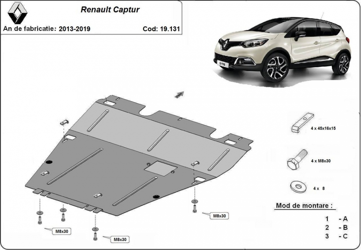 | Minden autóban gyári csavarlyukak vannak a motorvédő lemez felszereléséhez, ami nagyon egyszerűvé teszi a felszerelést. Ezt megteheti saját maga, vagy bármely autószervizben. |