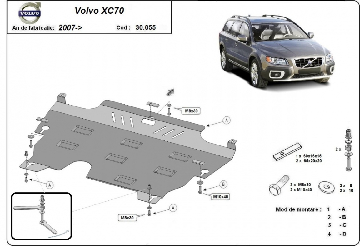 Very pleased indeed with the steel sump guard which I fitted to my Volvo XC70. It's a very well-designed item that adds useful protection to the underside of the car. The mountings make fitting it very easy. If you're likely to take your vehicle anywhere where the sump might be at risk of damage, this is a 'must have' accessory. Highly recommended.
