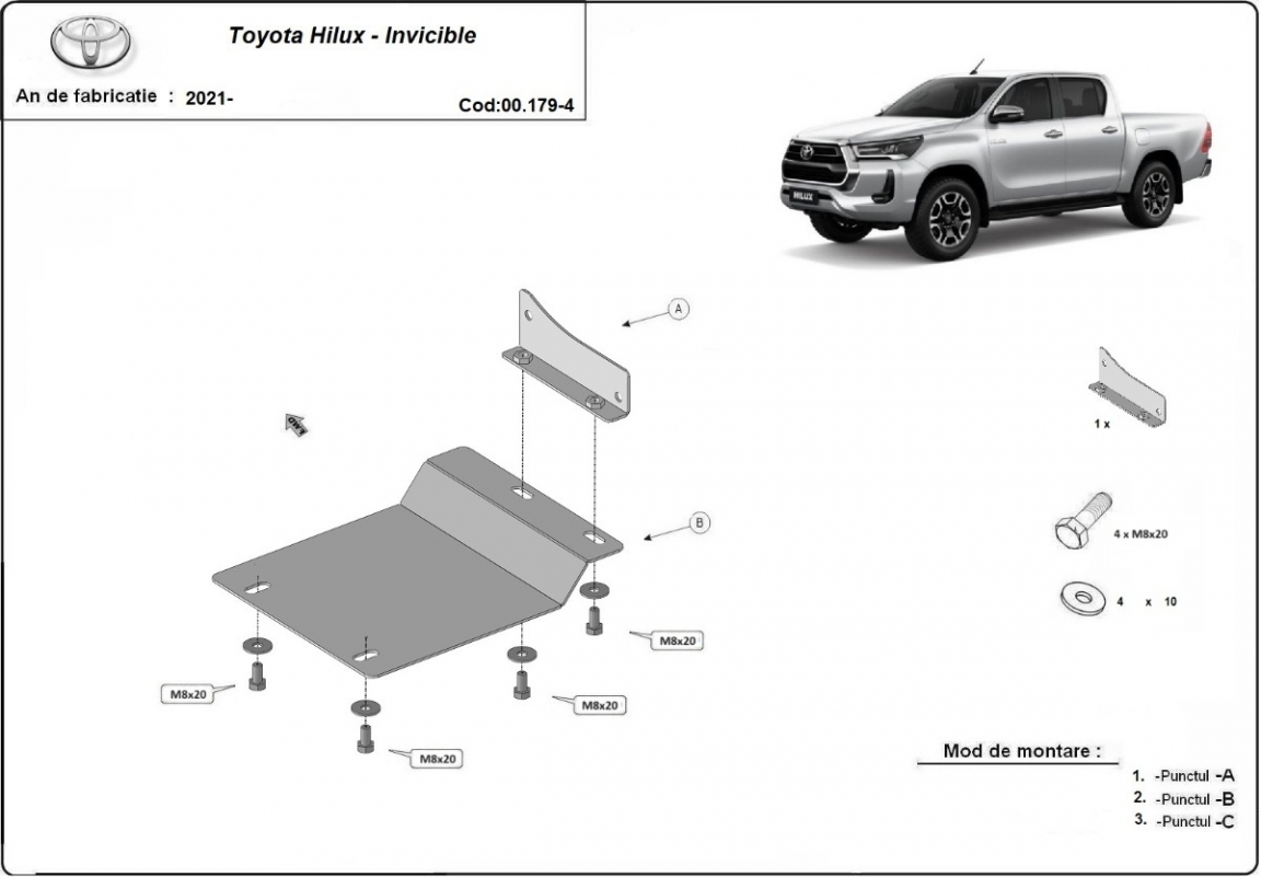 Acél motorvédő lemezünk a következőket védi: részecskeszűrő érzékelő A motorvédő lemez új, és tökéletesen illeszkedik a Toyota Hilux összes 2021 és 2026 között gyártott változatához. 2 mm vastag Acéllemezből készült. Gyárilag kialakított pontokhoz csatlakozik. Méretpontos, A38 H2H acéllemez Minden szükséges tartozék és csavar a csomagban! Minden motorvédőlemezünk porszórt bevonattal van ellátva(porfestett felület), hogy megakadályozza a korróziót. Méretpontos acél lemezekből készül. |