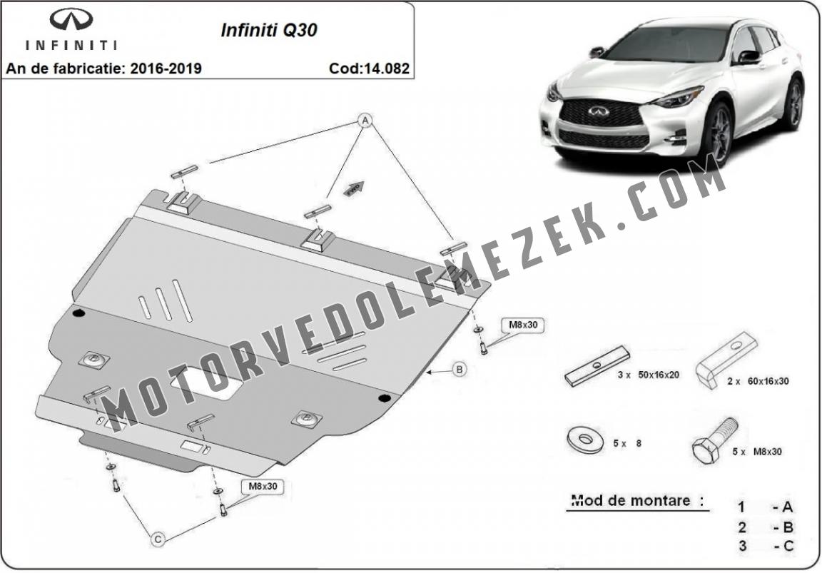 Acél motorvédő lemezünk a következőket védi: engine, gearbox A motorvédő lemez új, és tökéletesen illeszkedik a Infiniti Q30 összes 2016 és 2019 között gyártott változatához. 2 mm vastag Acéllemezből készült. Gyárilag kialakított pontokhoz csatlakozik. Méretpontos, A38 H2H acéllemez Minden szükséges tartozék és csavar a csomagban! Minden motorvédőlemezünk porszórt bevonattal van ellátva(porfestett felület), hogy megakadályozza a korróziót. Méretpontos acél lemezekből készül. |